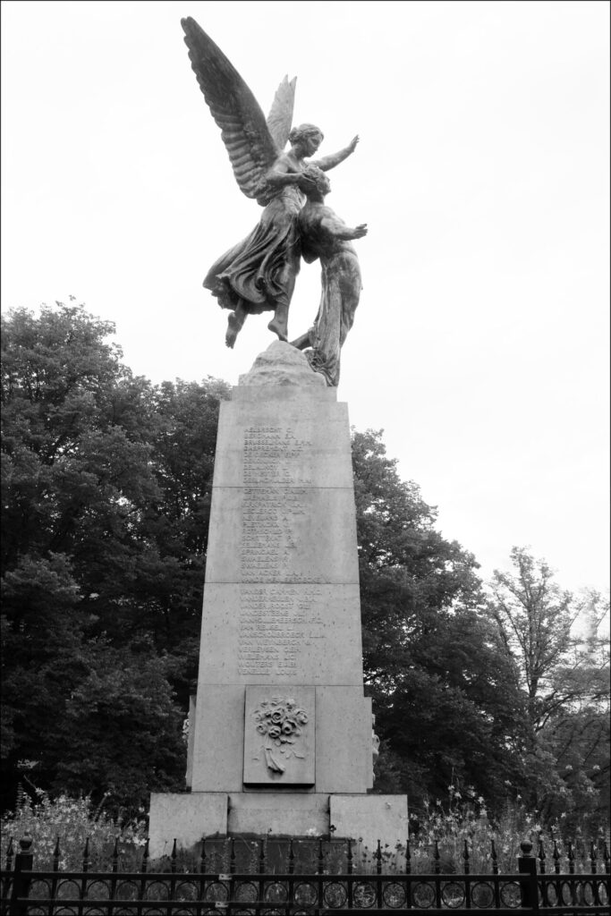 Dit symbolisch monument van Ukkel werd ingehuldigd in 1925 en brengt hulde aan de helden van de Eerste en Tweede Wereldoorlog. Het bestaat uit een afgeknotte obelisk in blauwe steen met daarop een verguld bronzen beeldhouwwerk dat een gevleugelde vrouw voorstelt die een stervende soldaat ondersteunt. Deze vrouwenfiguur kan een engel symboliseren, een gevleugelde Nike of het vaderland zelf, dat “zijn kind” draagt dat in de strijd gesneuveld is. De naaktheid van de soldaat belichaamt de universaliteit en de tijdloosheid van zijn offer.