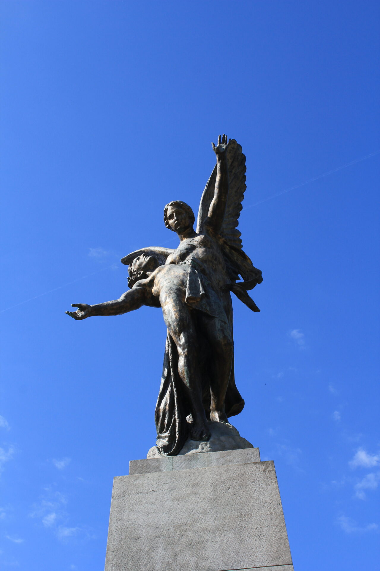 Inauguré en 1925, ce monument emblématique d’Uccle rend hommage aux héros de la Première et de la Seconde Guerre mondiale. Il se compose d’un obélisque tronqué en pierre bleue, surmonté d’une sculpture en bronze doré représentant une femme ailée soutenant un soldat mourant. Cette figure féminine peut symboliser un ange, une Victoire ailée, ou encore la Patrie elle-même, portant « son enfant » tombé au combat. La nudité du soldat incarne l’universalité et l’intemporalité de son sacrifice.